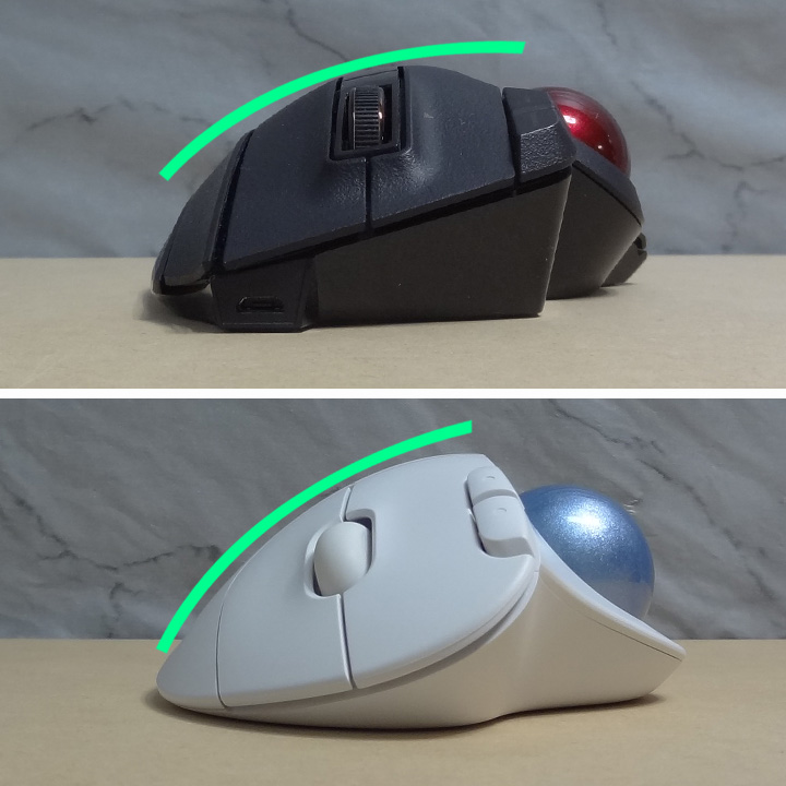 本機は横スクロールができるため、その分、スクロールホイールを挟みクリックと右クリックと間が広くなってしまっています。Logicool ERGO M575が11mm、本機が14.2mm、3mm以上指を広げないといけないので思ったより手を広げる感じになります。