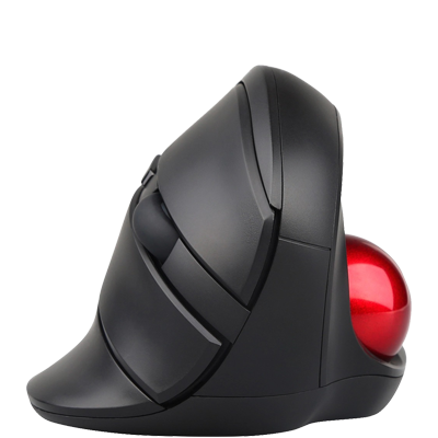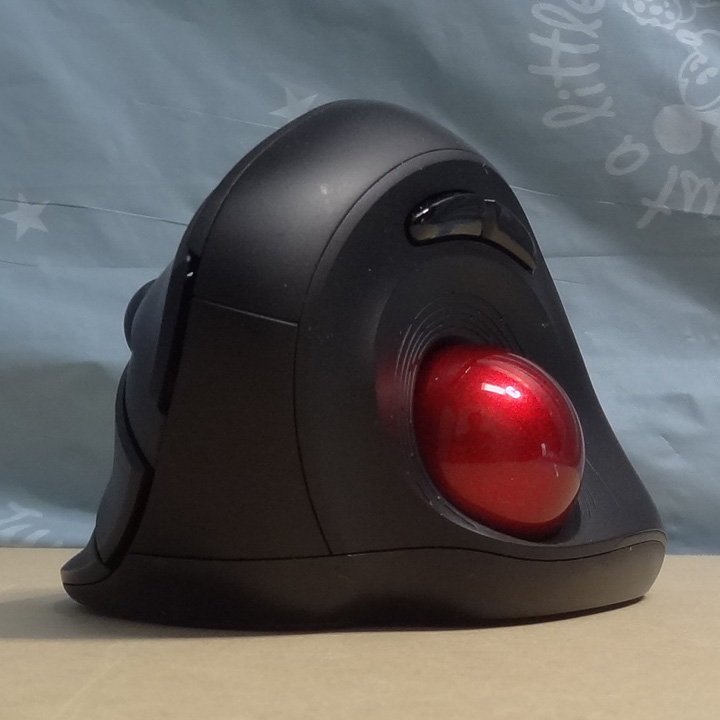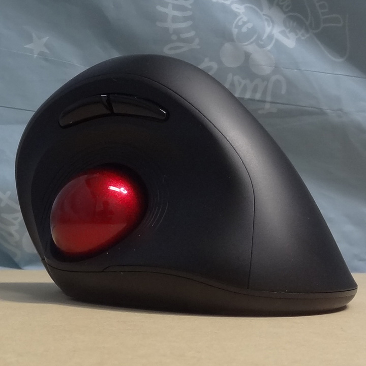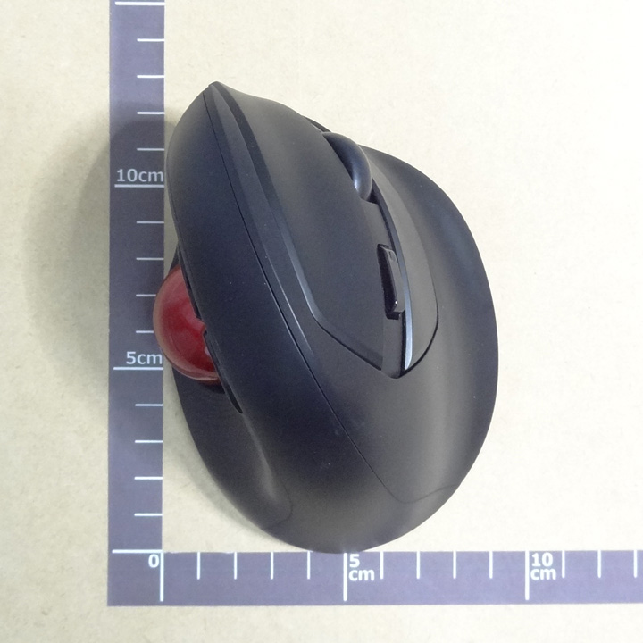 エルゴノミクスデザインとなっています。「手を置いた形が自然になります」とか「手首を動かさなくていいので、疲れにくい!」と言うのがウリらしいですが、そもそもクリックやスクロールホイールに手を合わせると親指がボールの上っ面しか触れません…届かない…ピアニスト並みに手が開かないと親指がボール全体には届かないです。上っ面で操作はできますが思いっきり下へポインターを動かしたい時など何度もちょこちょこ動かす感じになります。横移動もボールの真横ではなく上っ面回してるので山なりの軌道をたどります。同じエルゴノミクスデザインのKensington Pro Fit Ergo VerticalKensington Wireless Trackballと比べるとボールの位置が全然違います。手を自然な状態に傾けた時、親指はKensingtonモデル辺りが限界だと思います。ナカバヤシのMUS-TBIF182BKでもやはりボールは上に配置されています。