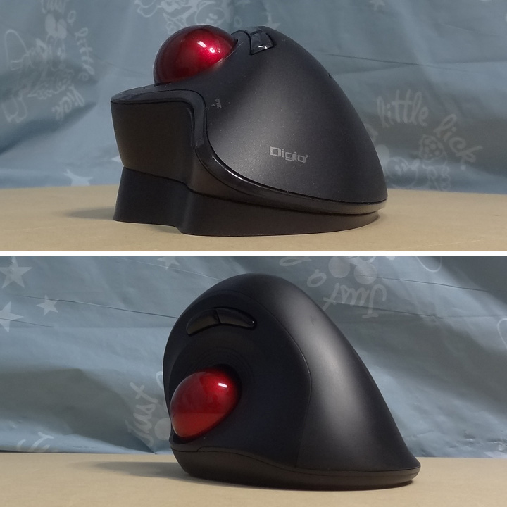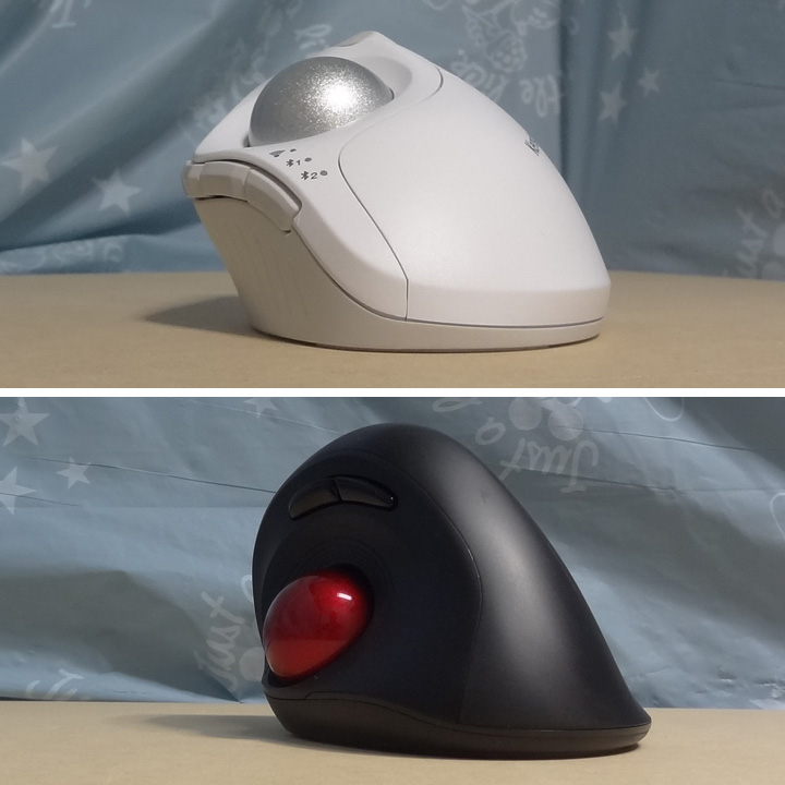Kensington Pro Fit Ergo Vertical Wireless TrackballとナカバヤシDigio2 MUS-TBIF182BKとの比較。3機種ともエルゴノミクスデザインとなっている。Kensington、ナカバヤシのトラックボールを見てわかるようにボールの位置はクリックから離れてもこれが限界…本機の位置だと離れすぎてボール操作が難しい。ただでさへややこしくて難しいのに。