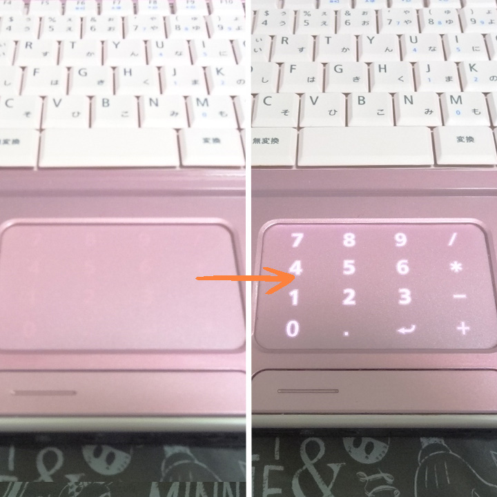 NumLKの操作でタッチパッドがテンキーになります。マウスで操作する場合はタッチパッド必要ないので意外に便利です。