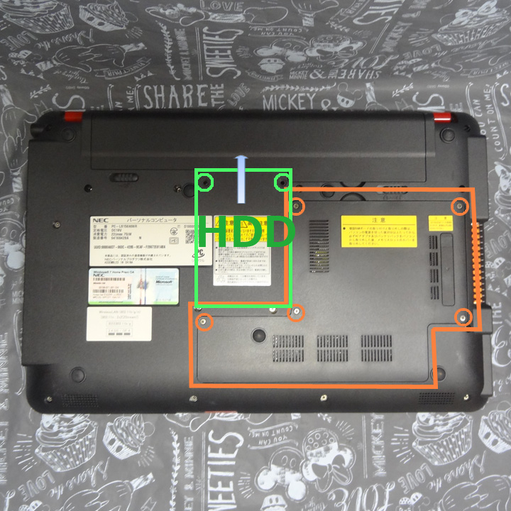 CPU換装などは写真の枠を外すとできるようになっており、メンテナンスしやすい機種です。またHDDはバッテリーを外してバッテリー側から引き抜く感じになります。